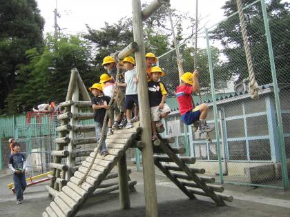 1年生に人気のターザンロープ。遊び方の指導と定期的な遊具の点検をしっかりしています。登校後、校庭で元気に遊ぶ子どもたち。7年前は全校児童数が250名でしたが、年々増加し、今年は430名。安全第一で、遊びのルールも変えてきました。サッカーができなくても高学年は、バスケットやドッジボールなど工夫して遊んでいます。子どもは、遊びの名人です。わずかな時間ですが、朝の集団遊びを通して学ぶことが多い「ひがたまっ子」です。