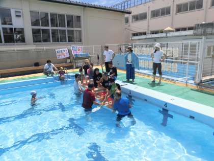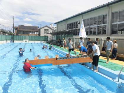 8月28日(日)のアドベンチャーin多摩川を控え、出場する2艇の進水式がありました。おや児の会の皆さん、PTAの皆さん、そして、子どもたちで準備を進めてきましたが、実際に水の上に浮かべてみるのは初めて。計画通り、みごとに2艇とも進水OKだったのですが、本番までに修正が必要なこともわかりました。