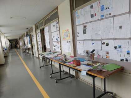 夏休みの自由研究で作ったものが、ろう下に展示されています。それぞれ、よく工夫されいて、だれもが夏休みの間にがんばって作ったり調べたりしたことがよくわかります。