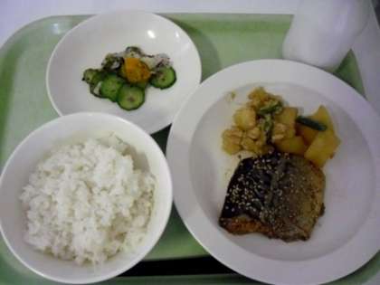 献立は「ごはん、牛乳、サバの七味焼き、じゃがいもの甘辛煮、野菜のゆかりかけ」でした。