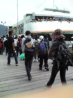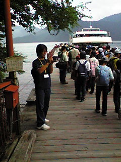 7/26(土)午後2時40分菖蒲ケ浜に到着。中禅寺湖汽船は満員。玉堤小学校や九品仏小学校の皆さんと一緒に乗船。疲れもみせずみんな元気です。記事を訂正し再送しました。