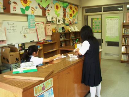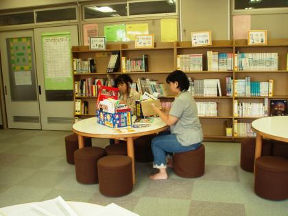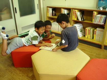 夏季水泳指導期間中の9:30〜11:00は、図書室を開放しています。空調の効いた部屋になっているので、子供たちもゆったりと本を読んでいます。また、読み聞かせをやっている時もあります。テーブルで学習することもできます。