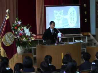 入学式は、たくさんの地域・保護者の皆さんに見守れて温かな入学式でした。校長先生のお話では、大きなスクリーンにキャラクターが映し出されて、学校生活で大切なことを教えていただきました。登下校時、黄色い帽子の1年生をよろしくお願いします。