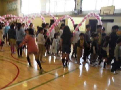 1年生と2年生以上の子どもたちの出会いの会、「1年生をむかえる会」が開かれました。代表委員会の子どもたちが企画、運営して、1年生に学校の楽しさと、これから仲良くしようという気持ちを伝えました。6年生と手をつなぎながら入場した1年生は、ひな壇にすわってみんなに注目されて少し戸惑った表情。でも、会が進むにつれて笑顔がいっぱい、クイズに正解すると大喜び跳びあがっていました。そして、6年生は、昨年度に練習、発表した「君の瞳に恋してる」を全員で合奏しました。間近で見聞きする迫力の演奏に圧倒されているような1年生でした。