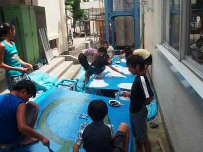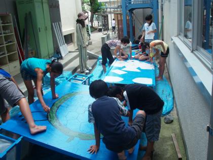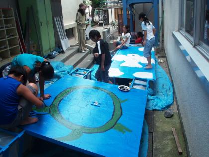 今日は筏に今年のメインテーマとなる、大きな図柄を描きました。手前のいかだには大きな亀、そして奥のいかだには白い鳩が描かれました。そしてこの図柄に沿って、乗船者のコスチュームも考えられています。亀はどうやら、浦島太郎のようです。鳩は校章からイメージしているらしく、どのような衣装を考えているのか楽しみです。