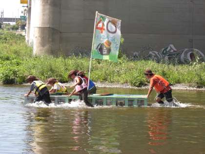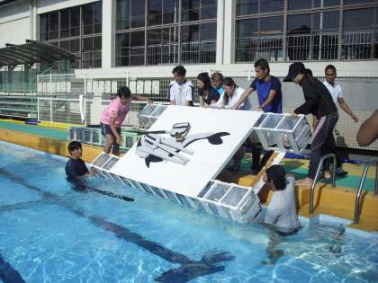 筏づくりは、6月の学校公開週間の時に、青少年委員の石山さんを始め、おやじの会のお父さん方が一艇は修理し、一艇は新しく作ってくださいました。当日の運搬には、学校運営委員の和田さんやおやじの会のお父さん方にお世話になりました。