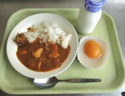 献立は『チキンとトマトのカレー、牛乳、おかしな目玉焼き』でした。