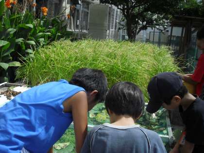 休み中「今年はお米も豊作」と喜んでいたら、「先生、毎朝 雀がたくさん飛んできてお米を食べていますよ。」という報告を受け、5年生がネットをかけてくれたのですが、かなり雀の群れに食べられてしまいました。残念。