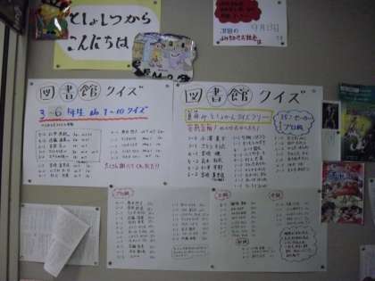また、夏季休業中の図書室開放の時に挑戦した図書館クイズの結果が掲示されました。