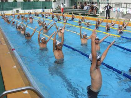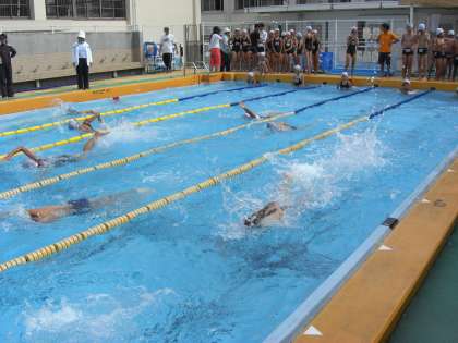 世田谷区立小学校の6年生が参加して行われる世田谷区水泳記録会が、各学校において行われました。大勢の声援を受けて泳ぐ子どもたちの記録は、練習時のタイムより速くなっていました。25メートルと50メートルリレーには、教員も参加しました。