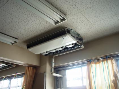 念願の冷暖房機が各教室に設置されます。教室窓側の天井に2台の機械がつきます。今回の工事で、1年生から6年生までの各教室(3年1組を除く)と家庭科室、理科室、図工室に設置されます。