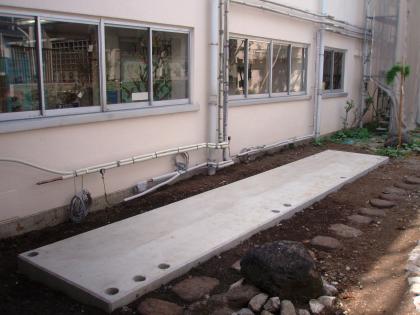右側の画像は、体育館入り口脇ですが、大型の室外機が設置されます。電気のものと違い、一台の室外機で3〜4教室分をまかないます。現在ガス関係の配管工事の真っ最中です。