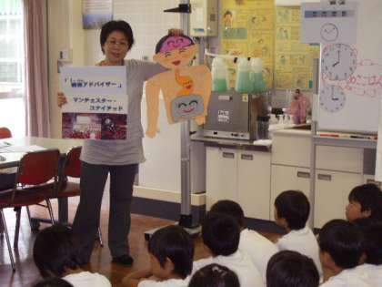 身体計測前に、毎回「からだのお話」をしています。今回のテーマは、「体内時計と電子メディア」です。「ひがし君」と一緒に体内時計について学習しました。
