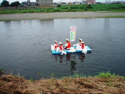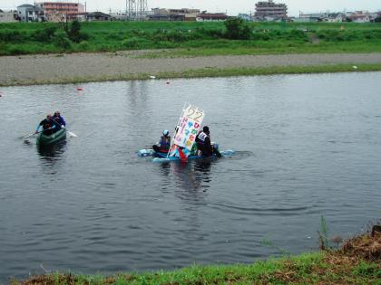 まず先にNO.22「ひがたまサマードリーム号」が出艇。イカダには大きなカメが描かれ、クルーは浦島太郎をイメージしたコスチュームでした。時間おいてNO.45「チャレンジシップひがた丸」が出艇。こちらは、校章にも描かれている平和のシンボル鳩です。クルーは全員白い鳩をイメージしたコスチュームです。