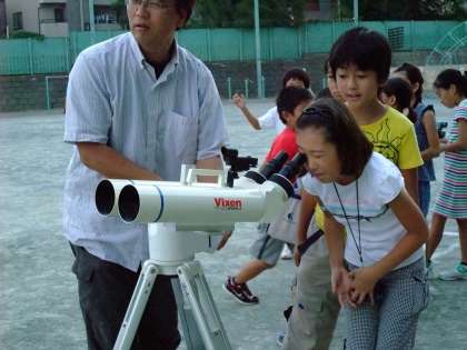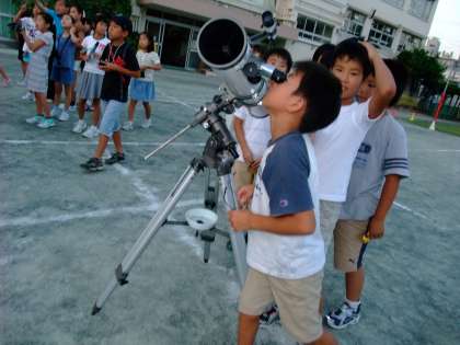 学校運営委員会学習支援プロジェクトの一環として、4年生を対象とした月と星の観察会が開かれました。学校にある天体望遠鏡ばかりでなく、地域のみなさんが持ち寄ってくださった望遠鏡や双眼鏡を使って、中秋の名月を観察しました。さいわい晴天に恵まれ、少しずつ暗くなっていく空にみごとな満月を見ることができました。今年は、さらにラッキーなことに木星を見ることができました。木星の周りの4つの衛星もはっきり見えました。視聴覚室で星の話をうかがいとてもいい勉強ができました。ご協力くださった皆様ありがとうございました。