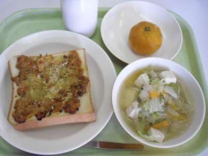 9月13日(月)カレーチーズトースト、キャベツと豆腐のスープ、冷凍みかん