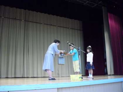 全員の紹介はできませんでしたが、上位3名に記念品を渡しました。図書室の浦さんからのプレゼントです。夏季休業中の図書室開放ボランティアのおかあさんたちも、クイズの答えあわせのため、とても忙しかったと聞きました。でも、「予想以上に多くの子どもたちが挑戦してくれた」と喜んでくださいました。