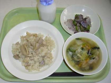 10月4日(月)の献立は「里芋ごはん、肉団子と野菜のスープ、大根のゆかり風味、牛乳」でした。給食委員さんからの感想は「大根のゆかりがかかっているのがすっぱかった」ということでした。ひがたまの子どもたちはゆかり好きが多いようで、今日の「大根のゆかり風味」もそうですが、ゆかりごはんなども残菜がとても少ない傾向があります。