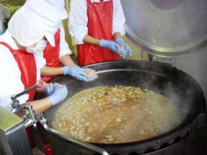 中央の写真は、スープに肉団子を落としているところです。鶏ガラでとったスープの中に調理員さん3人がかりで肉団子を落としていきます。湯気が立ち上る大きな鍋は、もし誤って触ると大やけどしてしまうので、十分注意しなければなりません。