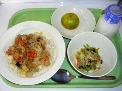 10月5日(火)の献立は「あんかけチャーハン、ごぼうチップサラダ、みかん、牛乳」でした。ごぼうチップサラダは、ささがきにしたごぼうを素揚げしてサラダにトッピングしています。残菜も少なくて、美味しく食べてもらえたようでした。