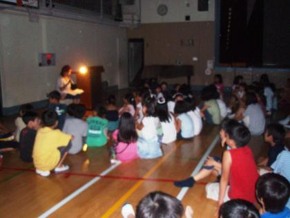 今年は、低学年はBOP室と視聴覚室、高学年は体育館からそれぞれスタートしました。いつも読み聞かせをしてくださる読書ボランティアの方が、怖い話の読み聞かせをして下さった後のスタート。きもだめしの雰囲気は絶好でした。歩くのはわずか50メートル程度の距離ですが、子ども達は夏休み最後の夜を楽しく過ごすことが出来ました。