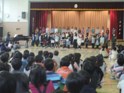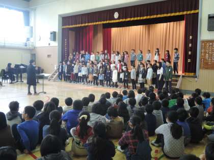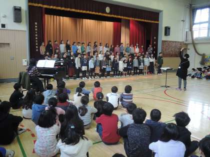 今朝の音楽朝会は、17日の合唱交歓会に出演する合唱団の発表でした。
