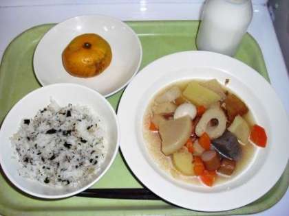 13日(水)の給食は、『じゃこ入りわかめごはん、洋風おでん、みかん、牛乳』でした。