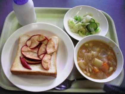 14日(木)は『アップルシナモントースト、カレービーンズシチュー、グリーンサラダ、牛乳』でした。アップルシナモントーストは、薄切りにしたリンゴにお砂糖とレモン汁、シナモンをまぶしておき、バターを塗ったパンの上にのせて焼いたものです。リンゴは紅玉を使いました。リンゴの甘酸っぱい香りが口に広がる一品です。
