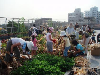 今日の作業は、収穫と秋まきの植物のための準備をしました。夏の屋上花壇は、花と作物が6:4ぐらいの割合になっています。夏の間は、鮮やかな緑の合間に、色とりどりの花が咲いています。これから冬にかけて、だんだん花の割合が増えていきます。
