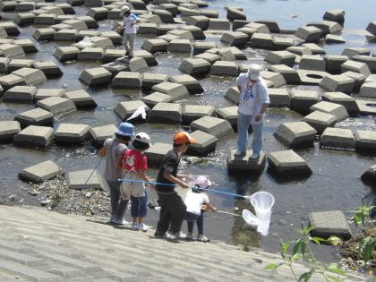 虫取りの合間に水辺の生きものを観察している子どももいました。
