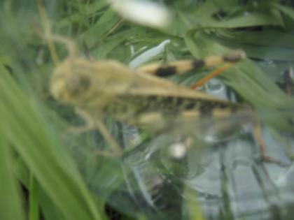 「観察カードに記録したら、逃がします。」と言われ、トノサマバッタを捕まえた○○くんは、残念そうでした。けれど、あまりの暑さに動きが遅くなったバッタの様子を見て草むらに逃がしてあげました。体長7センチ(大人の中指とちょうど同じ長さでした)のすばらしいトノサマバッタでした。(写真はペットボトルで作った虫かごの中のトノサマバッタです)