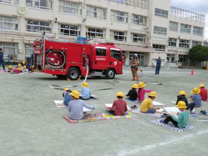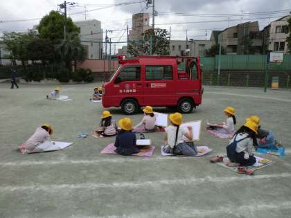 1年生がクレヨンを使って、大きな画用紙いっぱいに消防車や消防士さんの絵をかきました。