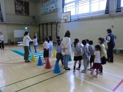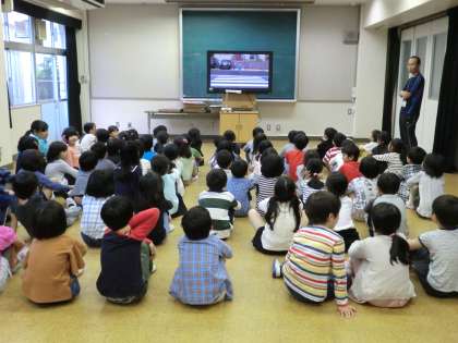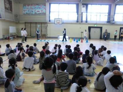 お話を聞いた後は、DVDを見たり、体育館で道路の渡り方の練習をしたりしました。