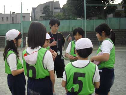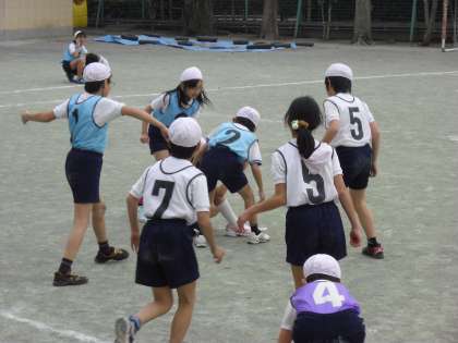 5年1組担任の川村教諭から5年生のボール運動の授業についてお話がありました。川村教諭は、子どもたちがボールゲームを通して運動に親しみ、技能を高め、友だちと関わり合いながらよい動きを作っていくことができるよう新しい球技を開発しました。ゲームに必要なパス、ラン、タッチという3つの要素を組み合わせて「パラタッチボール」という名前です。ラグビーボール型のゴムボールを使い、ラグビーとアメリカンフットボールを合わせたようなルールです。子供たちは、必要に応じてルールを変えながら、作戦を考えて作戦カードで動きを作っていました。「作戦を自分たちのきまりとして動きを作る」ということを指導することにより、子供たちの動きがよくなっていきます。パラタッチボールで培った動きが、その後のバスケットボールの授業にも生きてくることと思います。