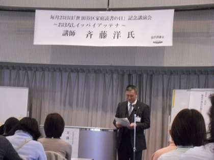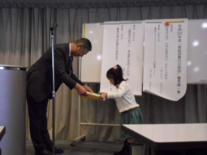その中で本校の1年生の標語が最優秀賞に選ばれました。11月23日家庭読書の日記念講演会の前に表彰式が行われました。360点の応募があったそうです。「賞に入らなかった人たちも、そのチャレンジ精神が大切です。」と記念講演を行った作家の斉藤先生からもコメントがありました。(記念講演の写真撮影は禁止でしたので、斉藤先生の写真はありません・・・)