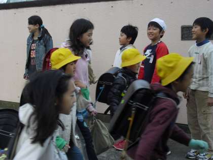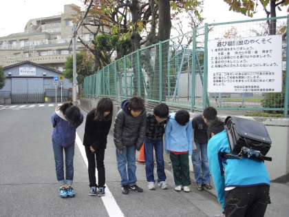 4月と11月は、あいさつ月間とし、教職員も交代で正門、あひる門に立ちあいさつ隊と一緒にあいさつをしています。先日は、3年生の子どもたちも担任と一緒にあいさつ運動に参加していました。