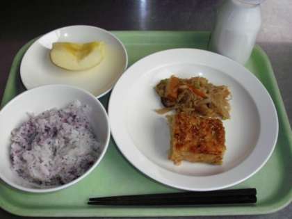 ☆2日(木)ゆかりごはん、松風焼き、切干大根とさつま揚げの炒め煮、りんご、牛乳