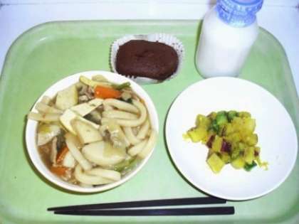 ☆3日(金)カレーうどん、さつまいもとかぼちゃのサラダ、おからマフィン、牛乳