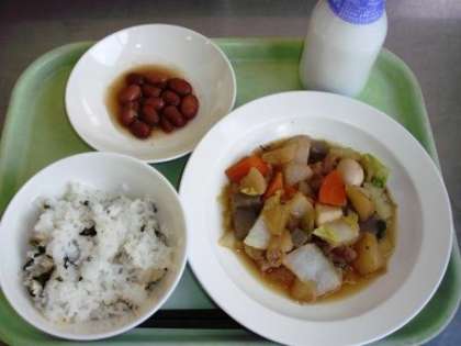 ☆6日(月)菜めし、豚肉と大根のうま煮、うずら豆の甘煮、牛乳
