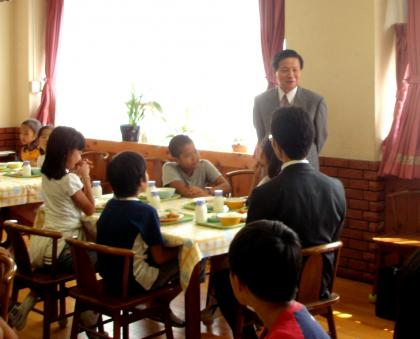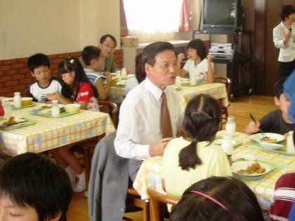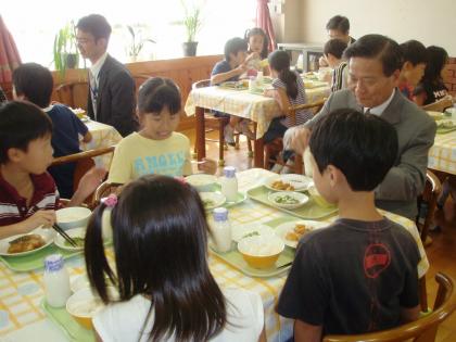鈴木大臣の最後の視察は、子どもたちとの給食でした。大臣の希望もあり、授業を見ていただいた4年2組の子どもたちと会食をして下さいました。この日のメニューは、ご飯、さばの七味焼き、じゃが芋の甘辛煮、野菜のゆかりかけに牛乳と和食系でした。またこの日のお米は「たくわえ君」という政府備蓄米を炊いたもでした。たくさん食べる子どもたちに大臣も感心ひとしきりでした。また、鈴木大臣から議員バッチを見せてもらいました。