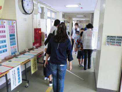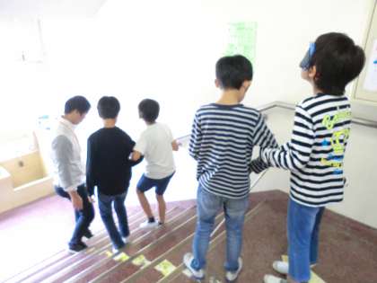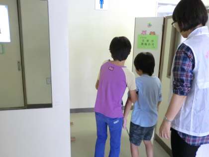 白杖の使い方や補助の仕方をご指導いただいた後に、二人一組になって白杖の体験をしました。階段の上り下りや廊下の歩行、トイレの使用など、アイマスクをすることで、視力の弱い方の身になって体験しました。子どもたちからは、とても怖かったという感想が聞かれていました。