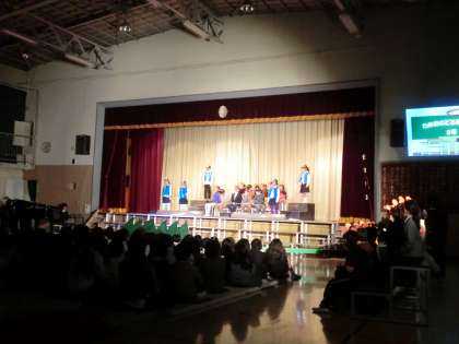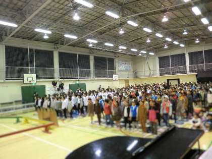 昨日のリハーサルまで、体育館にいるのは自分の学年の友達と何人かの先生、主事さんだけでしたが、今日はフロアいっぱいの子どもたちとお客様。