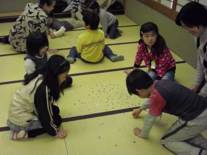 けんだま・こま・おはじき・あやとり・おてだまのグループに分かれ、ローテーションで回るようにしました。学校公開週間ということもあり、保護者の方にも入っていただきながら、初めての子も、何度もやったことのある子も十分に楽しむことができました。
