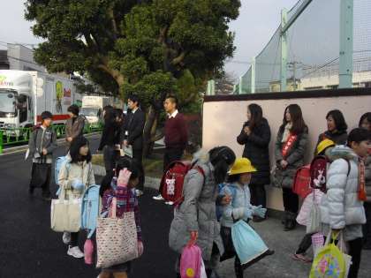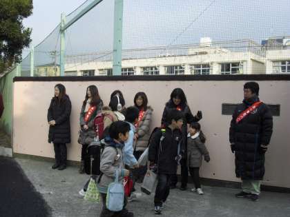 いつもは、5・6年生が校門や昇降口で「おはようございます」とあいさつして、在校生を迎えますが、今日は大人(教職員・保護者・地域の方々)も参加しました。