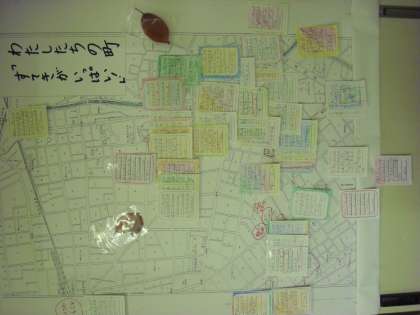 最後に、見つけてきたり、お話をうかがって思い出したりした「素敵」をカードにして、学校周辺の地図に貼ってまとめました。