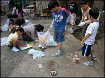 左:公園に探検に行き、ごみの種類や数を調べます。