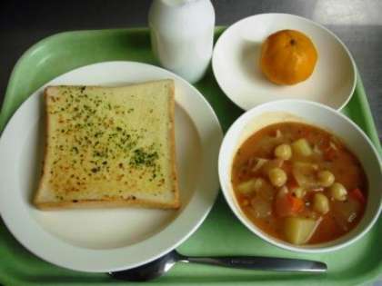 2月8日<献立>ガーリックトースト、ひよこ豆とチキンのトマトシチュー、ぽんかん、牛乳