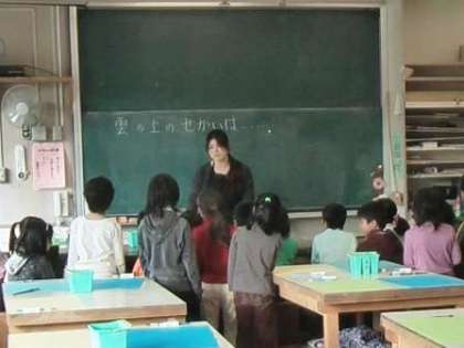 公開授業の中で子どもたちは、先生から雲の描き方の説明を受けた後、それぞれに雲の大きさや形を工夫して、雲の上の世界の下書きをしました。筆先に少し力を入れて紙の上に白絵の具を広げていくと、まるで本もののように立体的な雲ができあがりました。ウサギやドラゴンなど思い思いの形も工夫していました。そこに、雲の上の世界の物語をクレパスで描いていきました。想像を広げて、物語の主人公からたのしく描きはじめました。教室の授業とは違った笑顔で作品づくりに取り組む子どもたちが印象的でした。