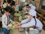 入学したての1年生。いよいよ給食が始まりました。お当番さんは白衣をきて上手に配ります。お行儀よくルールを守って並んで受け取ります。好き嫌いなく、残さず食べられるかな?