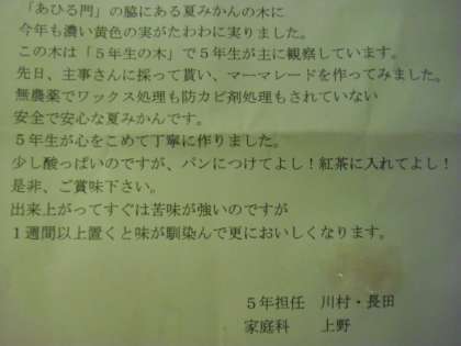 今年も、夏ミカンの木に大きな黄色の実がたわわに実りました。本校には、学年の木があり、この夏ミカンの木は5年生の木として、毎年、家庭科の時間にマーマレードなどを作っています。今年の5年生からも、お手紙と一緒にマーマレードが校長室にも届けられました。